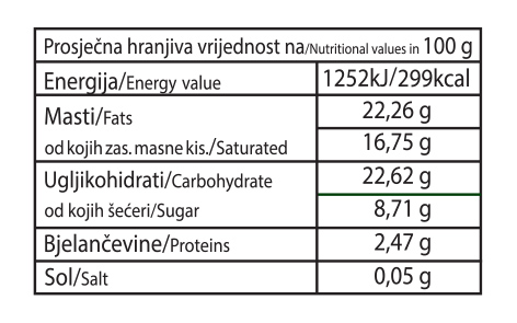 Sastojci: Rižino mlijeko * (voda, rižino brašno *, bjelančevine riže *), agava sirup *, rogačevo brašno * (11%), suncokretovo ulje *, kakao prah * (3%), suhe trešnje (2,7%), kokosovo ulje *, limunov sok *, guar guma.